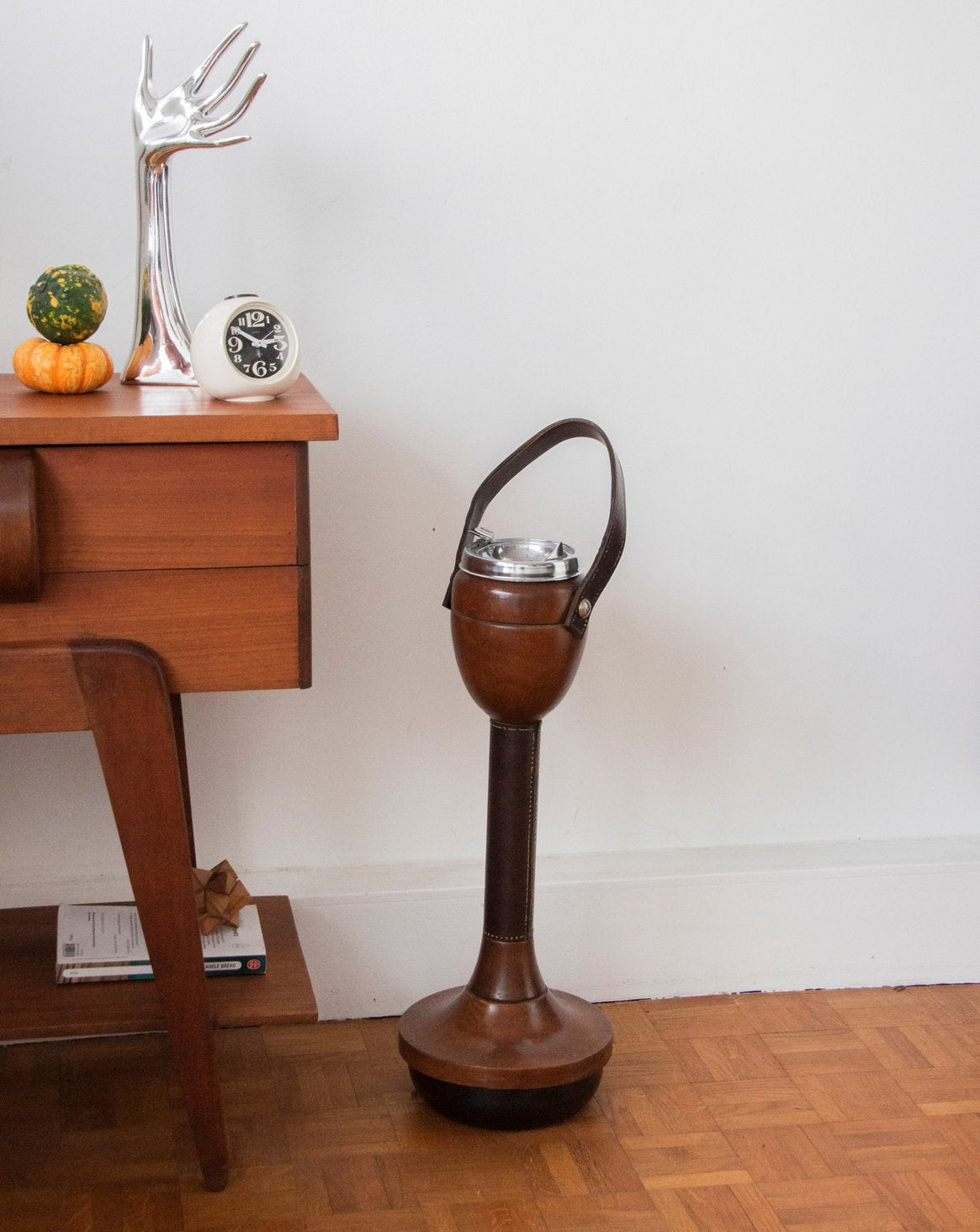Découvrez ce cendrier sur pied italien des années 1970, rare version luxe culbuto en bois massif et cuir. Son design iconique et son piétement surélevé en font un objet à la fois fonctionnel et sculptural, parfait pour une pièce de vie ou une terrasse. Les matériaux nobles confèrent une allure chaleureuse et raffinée, tandis que sa présence mesurée structure l'espace sans l'alourdir. Il apportera une touche de chic discret à un intérieur contemporain ou rétro.