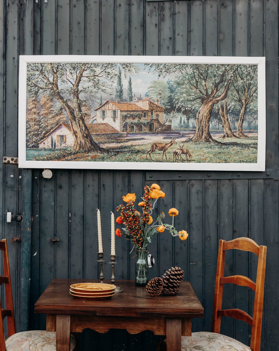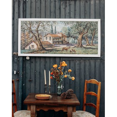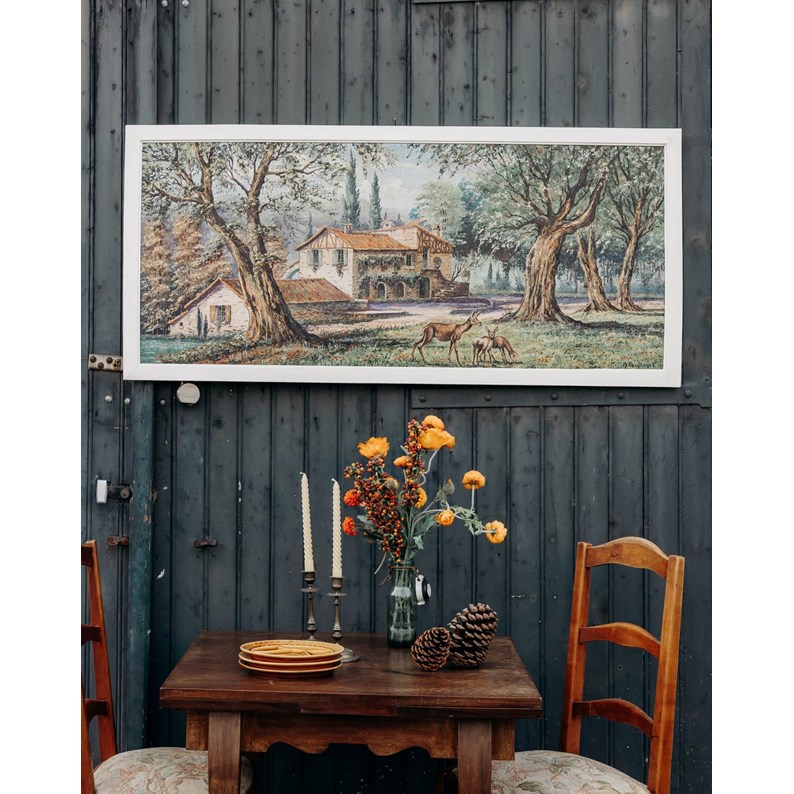 Découvrez cette toile ancienne de René Bondenet, peinte en 1955, qui restitue un paysage champêtre où une grange se love sous les arbres et où quelques biches animent la scène avec discrétion. La toile tendue sur châssis offre une matière chaleureuse et une patine naturelle, parfaite pour structurer un mur au-dessus d'un canapé ou dans une entrée, son format horizontal apportant une présence équilibrée et raffinée. Elle diffuse une atmosphère paisible et contemplative.