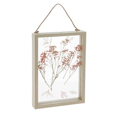 - Ce cadre en bois et en verre évoque les herbiers d'antan. Il dévoile une composition de plusieurs fleurs séchées : gypsophile rose, ruscus rose et immortelles jaunes.