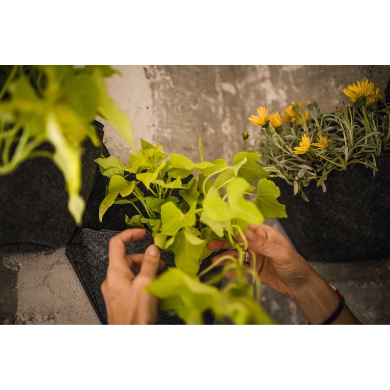 Montez le pot à l'aide des composants de fixation fournis. Vous pouvez créer des ensembles de pots pour concevoir un jardin vertical sur n'importe quel mur intérieur ou extérieur. Assurez-vous de placer le pot dans un endroit approprié afin que la plante reçoive la lumière et la température dont elle a besoin. Insérez la plante dans le pot. Remplissez les espaces avec de la terre et appuyez fermement pour la compacter. Passez la bande de bois à l'intérieur de la couverture textile pour lui apporter de la stabilité. N'oubliez pas d'arroser vos plantes – le système d'irrigation capillaire maintient une humidité constante au niveau des racines.