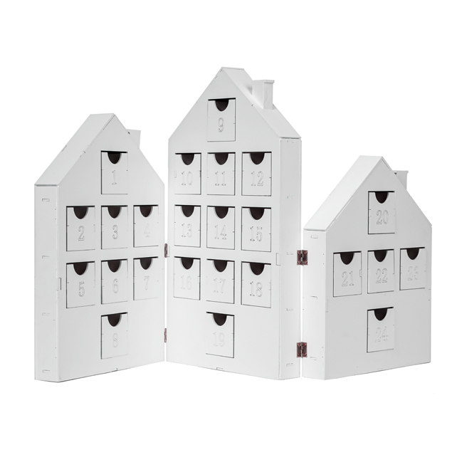 - Composé de 3 maisons blanches, ce calendrier de l'Avent s'installe dans la maison pour servir d'élément à part entière de la décoration de Noël.