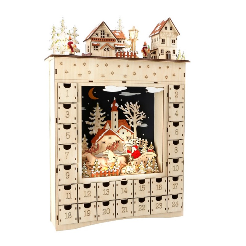 Ce calendrier de l'Avent lumineux en bois est équipé de LED ce qui permet de mettre particulièrement en valeur les jolies sculptures filigranes sur bois. Vingt-quatre petits tiroirs permettent de cacher les cadeaux de l'Avent (non fournis). Dimensions d'un tiroir : env. 4,5 x 5 x 4,5 cm.