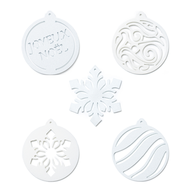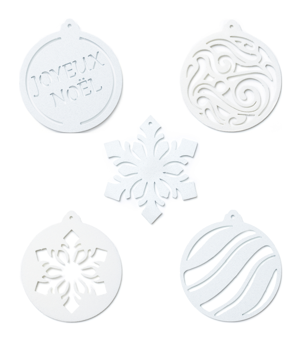 Découvrez nos 5 motifs : Design, Cristal, Vague, Flocon, Joyeux Noël ; déclinés en 5 coloris tendances : Or métallisé satiné, Vert sapin métallisé, Rouge brillant, Blanc métallisé, Noir Mica Perlé.