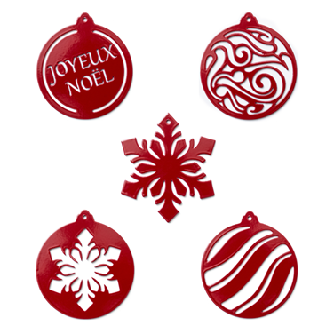 Découvrez nos 5 motifs : Design, Cristal, Vague, Flocon, Joyeux Noël ; déclinés en 5 coloris tendances : Or métallisé satiné, Vert sapin métallisé, Rouge brillant, Blanc métallisé, Noir Mica Perlé.