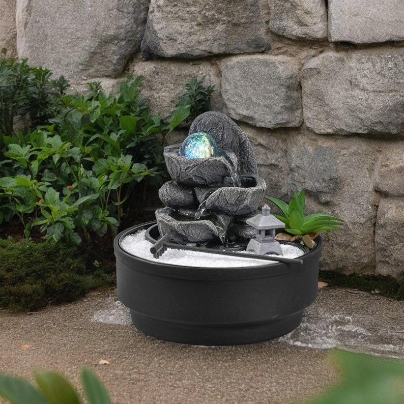 • Contenu : fontaine, pompe avec LED, sable, râteau, temple amovible