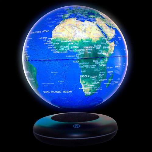 Ce planisphère flottant est disposé au dessus d'une base au contour circulaire soulignée par un discret et élégant faisceau de lumière bleue. Produit de la marque française MagneticLand, ce globe terrestre est une création originalequi montre tout le savoir-faire et la maîtrise technique de la France aux services de l'univers de la déco intérieur. Pour maintenir le globe terrestre dans les airs, ce système repose sur le principe de répulsion entre aimant et champ magnétique : l'aimant contenu dans le globe est maintenu en l'air par son interaction avec un champ électromagnétique permanent produit par le socle. De plus, par un simple toucher tactile sur le socle, il s'allume et change de couleur progressivement de l'intérieur pour en faire un objet vivant dans votre intérieur !Un champ électromagnétique est généré par le courant électrique au niveau du socle.