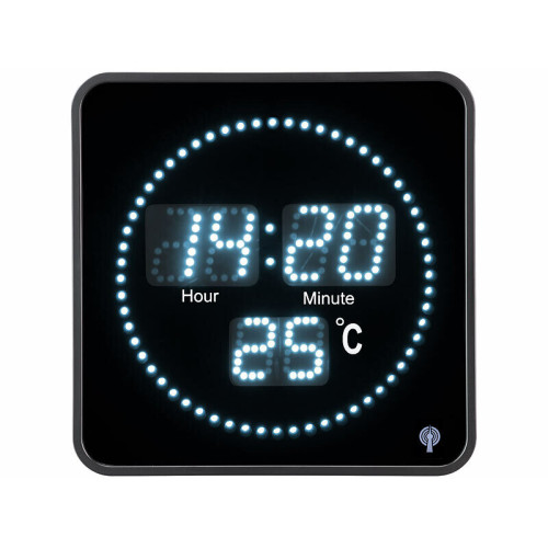 Sur cette horloge déco au design épuré et moderne, 185 LED blanches tournent et clignotent autour de l'écran marquent les secondes alors que l'heure et les minutes sont en affichage fixe.