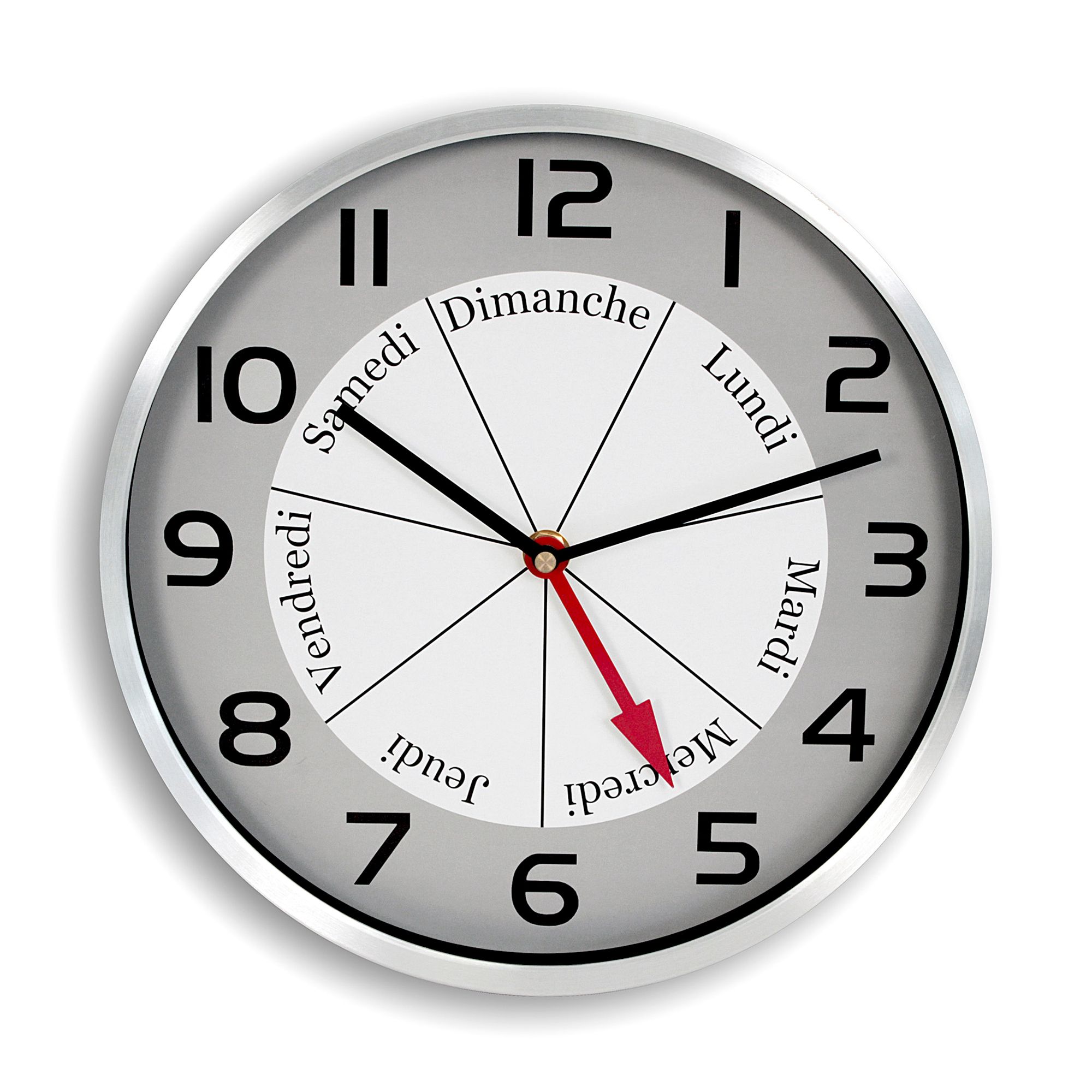 LISIBLE - L'horloge murale en aluminium indique les jours de la semaine en Français autour du cadran et une aiguille rouge pointe directement sur le bon jour afin de ne pas se perdre dans la semaine. La fond du cadran de couleur gris et blanc augmente la visibilitée de l'heure et du jour de la semaine. De plus les chiffres des heures taille 2 CM augmente le confort de lecture de l'heure plutôt pratique pour les personnes âgées par exemple.