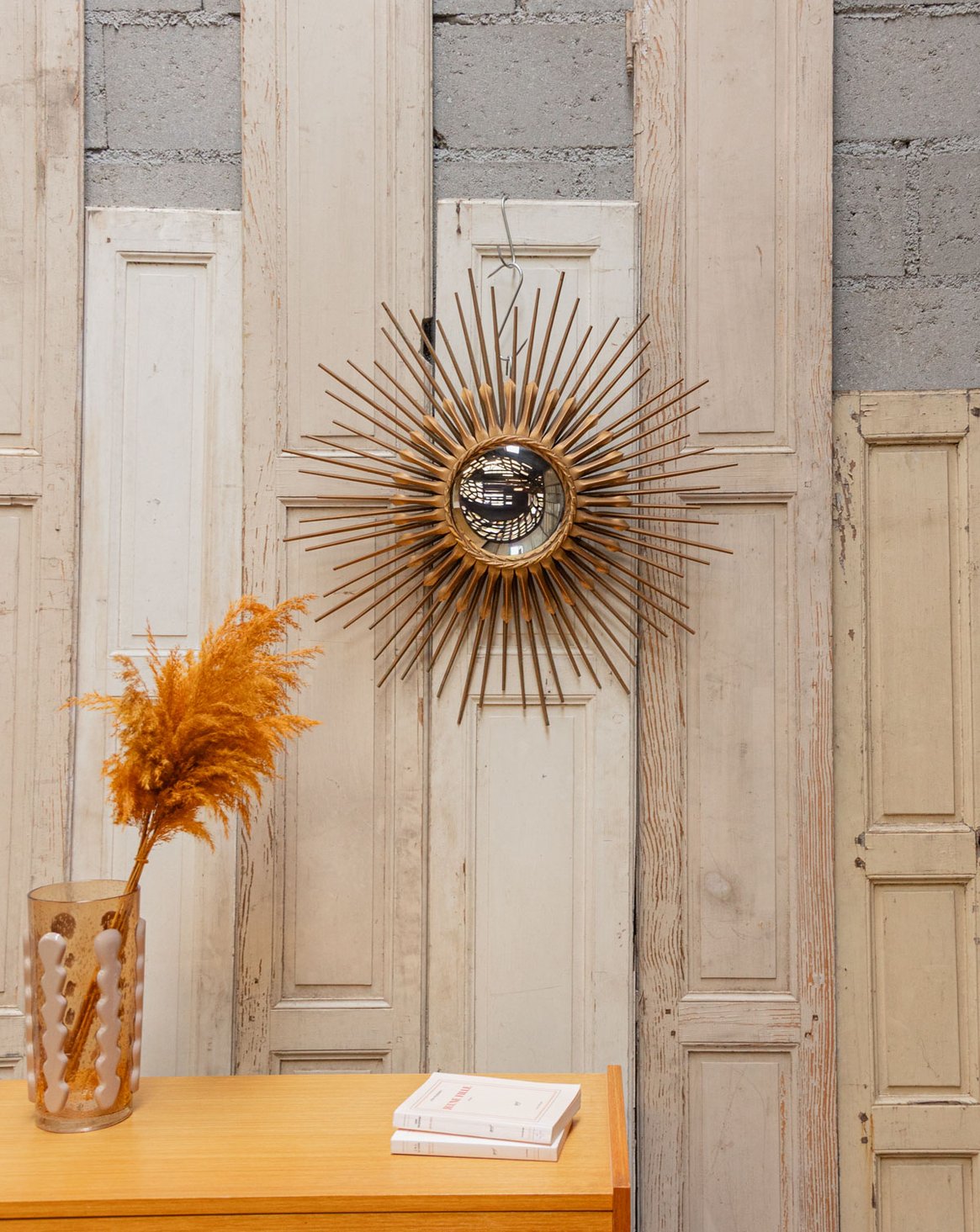 Sublimez votre intérieur avec ce miroir soleil ""sorcière"", dont les rayons graphiques sculptent la lumière et apportent une présence chaleureuse au mur. Il se pose en point focal élégant dans une entrée, un salon ou une chambre, tout en donnant une impression d'espace et de profondeur. Le cadre aux finitions dorées patinées et le miroir central témoignent d'un style rétro revisité, pour une ambiance raffinée et accueillante.