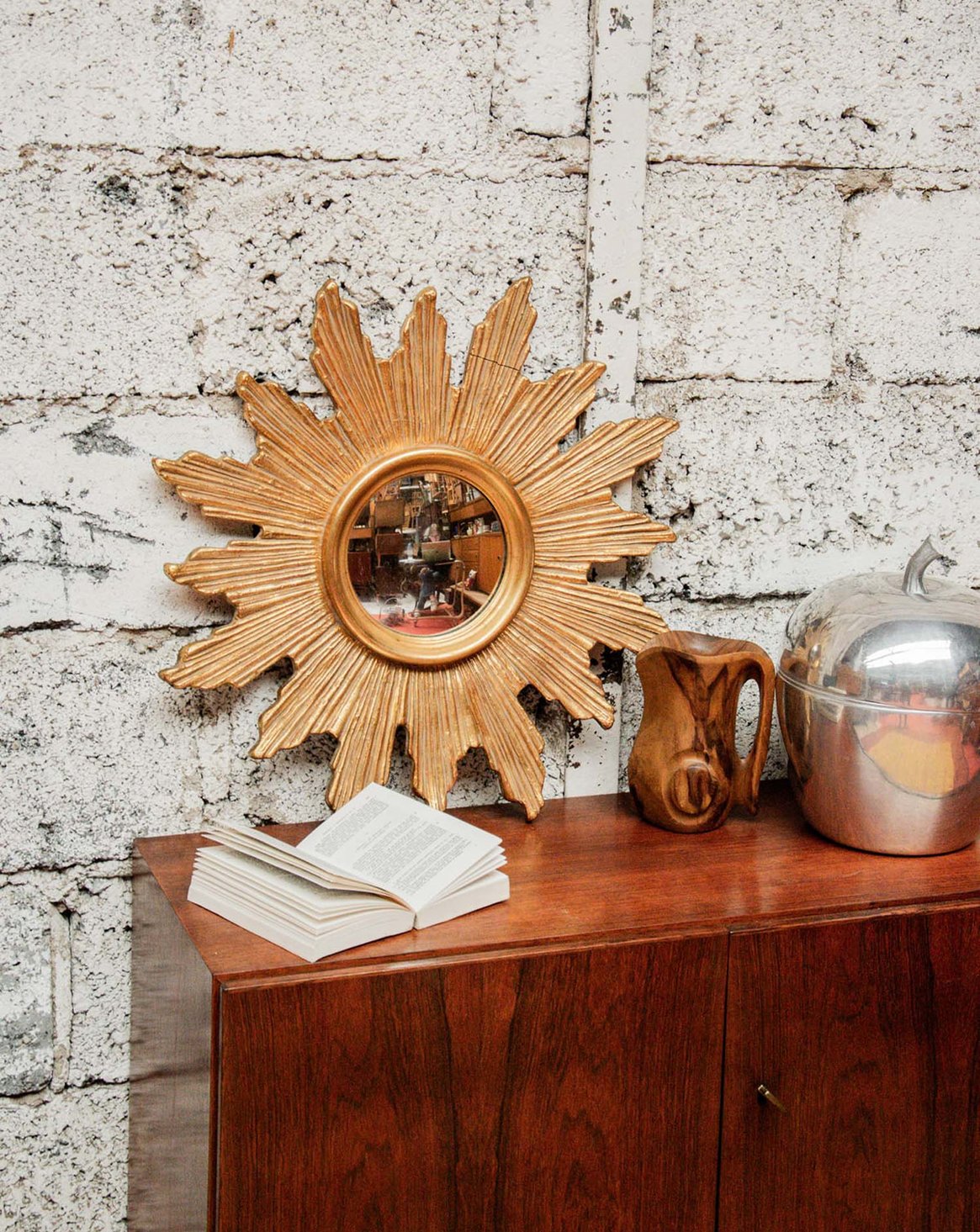 Apportez une touche d'élégance à votre intérieur avec ce miroir en forme de soleil. Sa structure en bois peint en doré reflète la lumière avec éclat, tout en ajoutant une note vintage à votre décoration. Idéal pour une ambiance chaleureuse, ce miroir sorcière saura sublimer n'importe quelle pièce tout en créant une illusion d'espace. Un incontournable pour les amoureux de style champêtre et raffiné ! Marques d'usure visibles.