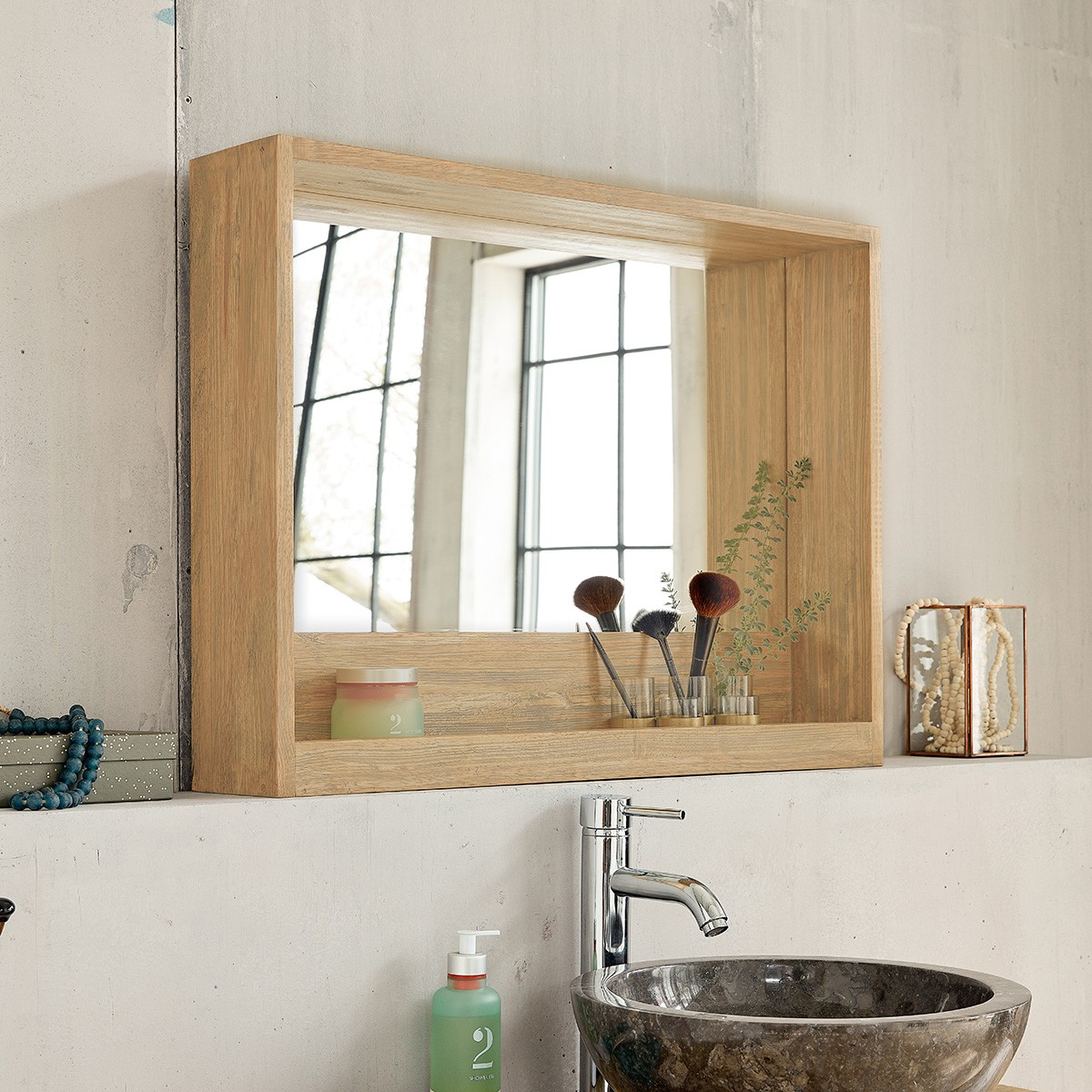 Laissez vous séduire par ce miroir de salle de bain en bois d'hévéa. Pratique ce côté double-emploi, miroir et rangement, vous permettra d'optimiser votre espace intérieur. Le miroir est fabriqué en bois d'hévéa. Ce bois connait une seconde vie en étant utilisé également pour la fabrication de meubles. Bois typiquement indonésien, il est robuste. Nous le traitons en amont pour l'humidité et les tâches. Caractéristiques : Matière : Hévéa - Couleur : Naturel - Hauteur : 60 cm - Longueur : 80 cm - Profondeur : 15 cm - Poids : 10 kg - Garantie : 2 ans - Montage : Livré monté.