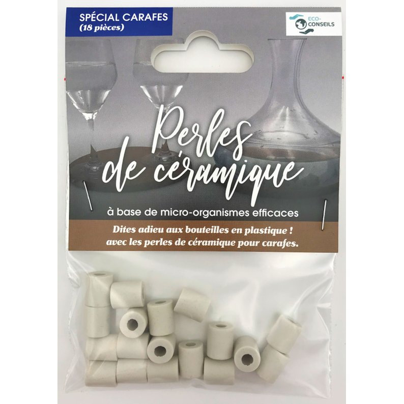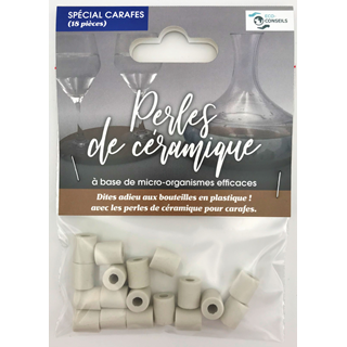 Déposez 18 perles de céramique dans un litre d’eau, dans une carafe, une bouteille ou une cruche remplie d’eau du robinet. Ces perles peuvent être déposées en vrac ou placées dans un sachet en mousseline bio.