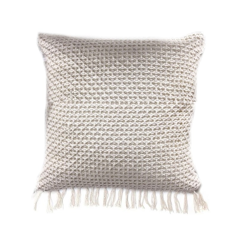 Vous allez aimer le charme de ce coussin offrant un revêtement tricoté. Vous apprécierez son extrémité à franges.