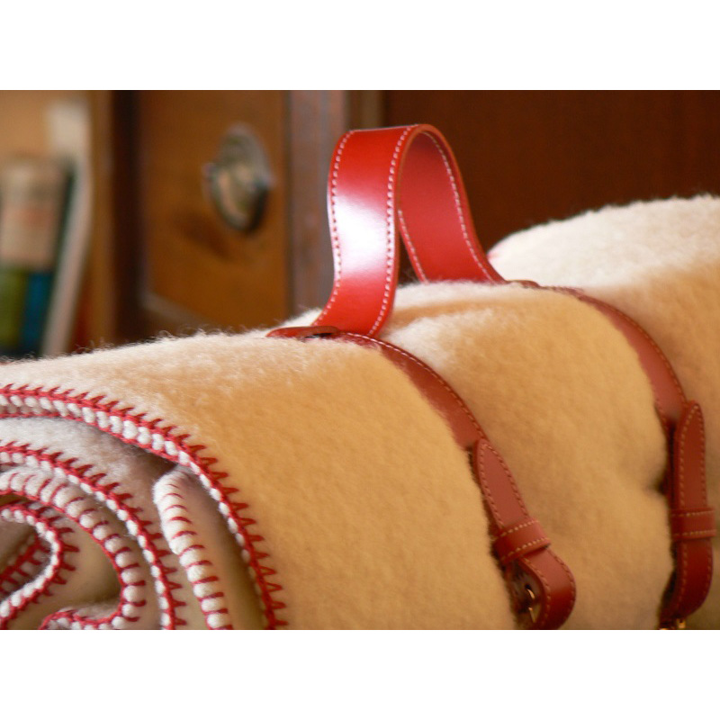 Plaid 100% laine naturelle coloris Ivoire, finition point de cheval Rouge. Roulé dans sa sangle en cuir véritable. Taille 120x180 cm
