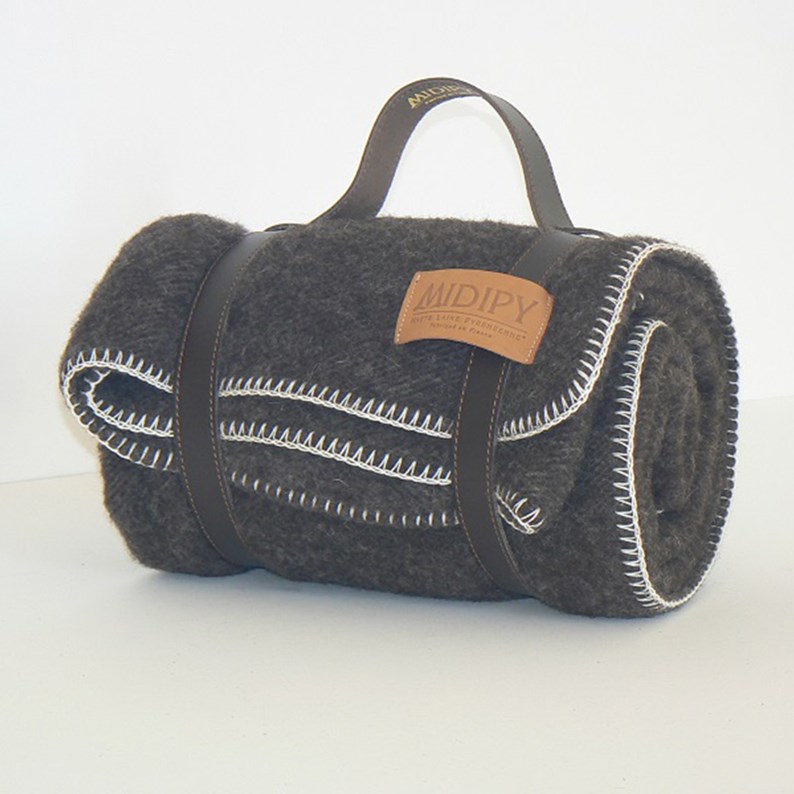 Plaid 100% laine naturelle coloris Chocolat, finition point de cheval Ecru. Roulé dans sa sangle en cuir véritable. Taille 90x120 cm