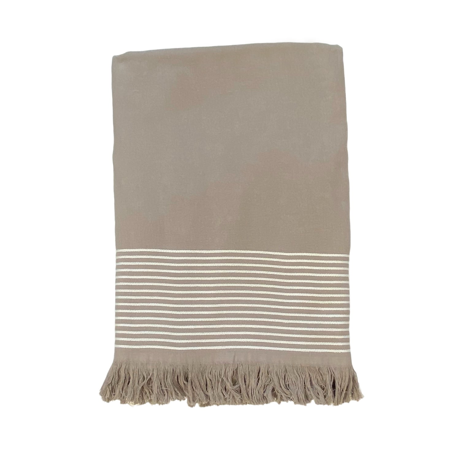 Nouée autour de la taille, elle se transforme en paréo. Discrète et raffinée, ses coloris unis avec une bande de petites rayures discrètes en font un article idéal pour tous.