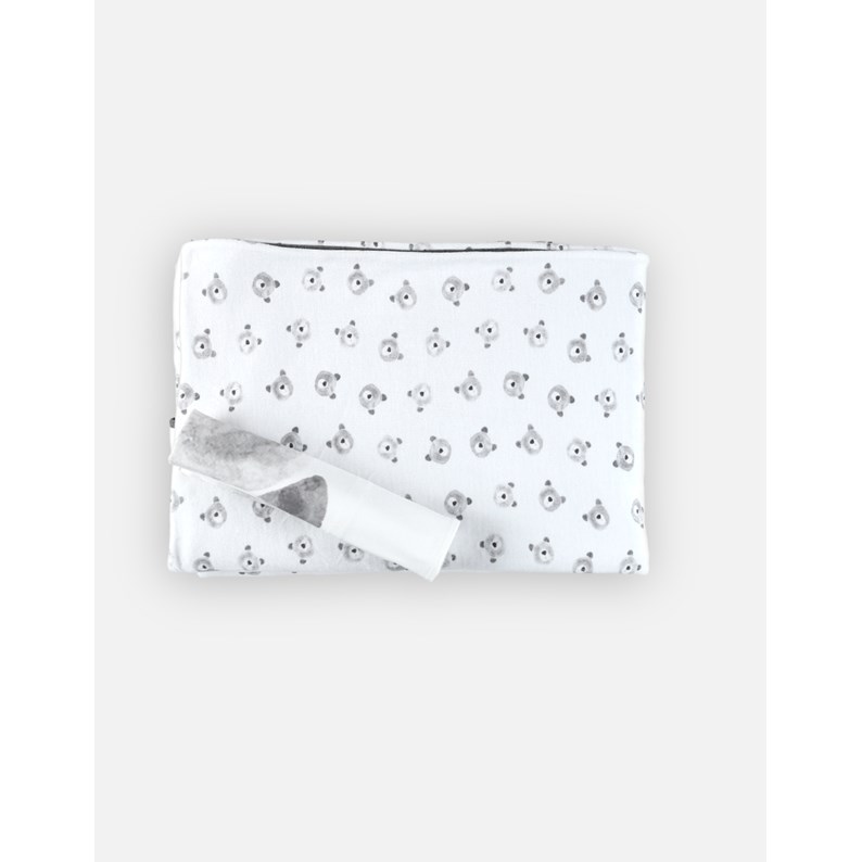 La housse de couette bi-matière blanche et grise peut aussi être utilisée comme couverture et reste toujours bien en place sous le matelas. Elle est composée d'une face en velours toute doux blanc imprimé de jolis petits oursons et d'une face en jersey de coton gris. Elle est livrée avec la taie d'oreiller en jersey blanc imprimé d'un joli ourson gris. Noukie's recommande d'utiliser la housse de couette pour les enfants à partir de 18 mois.