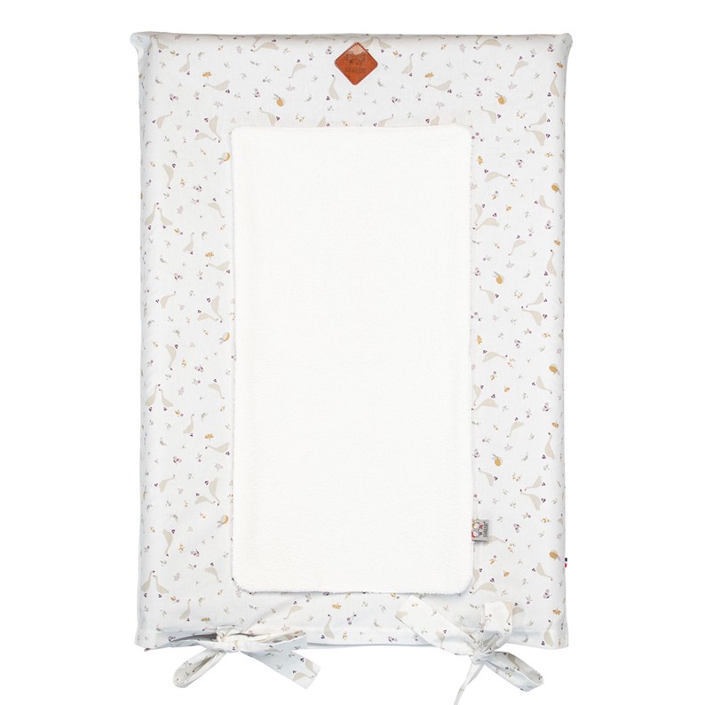 Inspirée par la collection Sidonia , cette housse de matelas à langer présente un design minimaliste et raffiné, parfaitement assorti à la décoration de la chambre de bébé. Les motifs floraux et les petites oies créent une ambiance chaleureuse et accueillante.