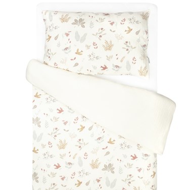 Plongez votre enfant dans un cocon de douceur et de légèreté avec notre parure de lit Aube , confectionnée en gaze de coton 100% naturelle. Avec ses teintes douces de vanille écru et ses motifs délicats de feuilles et d'oiseaux, cette parure convient parfaitement à une chambre de fille ou de garçon. Offrez une ambiance apaisante et intemporelle, en harmonie avec tous les styles de décoration.