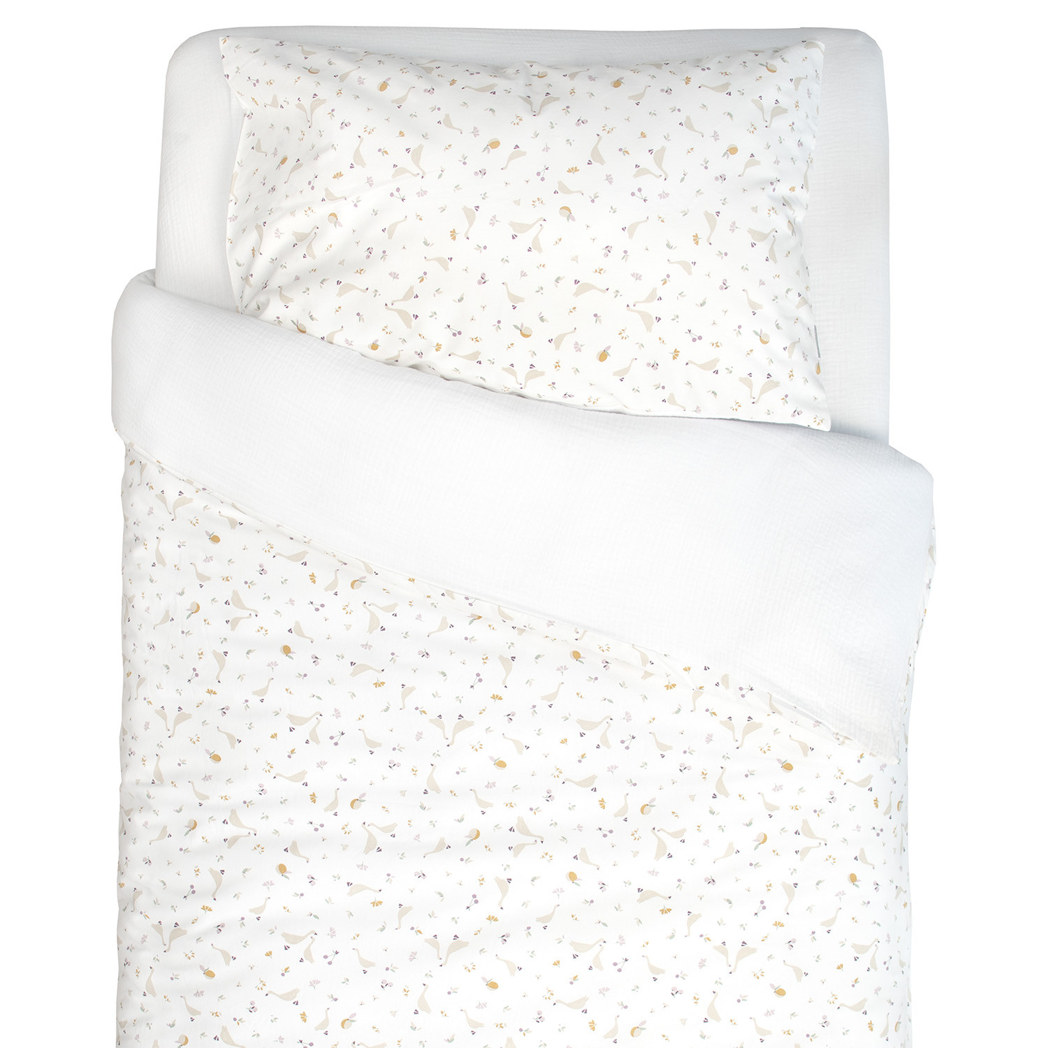 - Réversible : Une face imprimée avec de magnifiques motifs d'oies, baies, et fleurs, et l'autre en gaze de coton uni blanc.