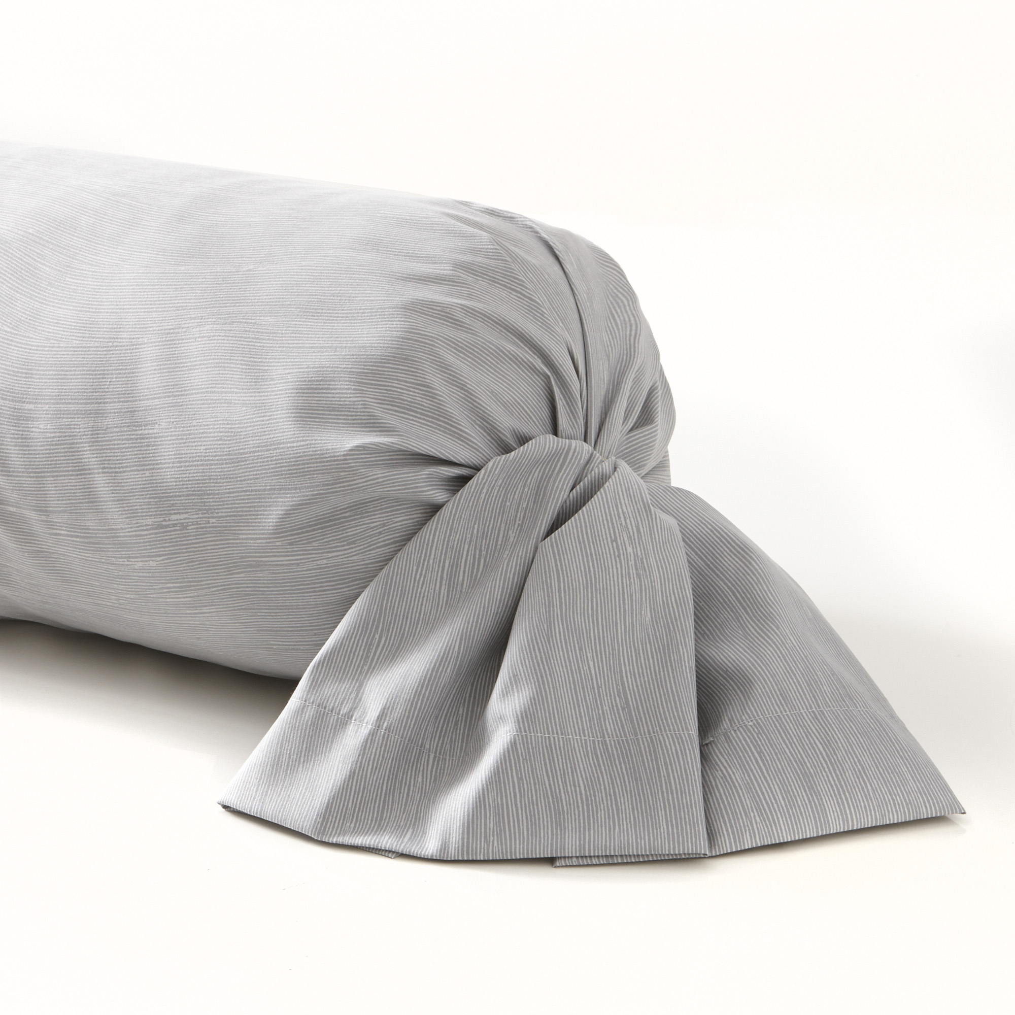 La taie de traversin est confectionnée dans un tissu à fines rayures en ton sur ton.
