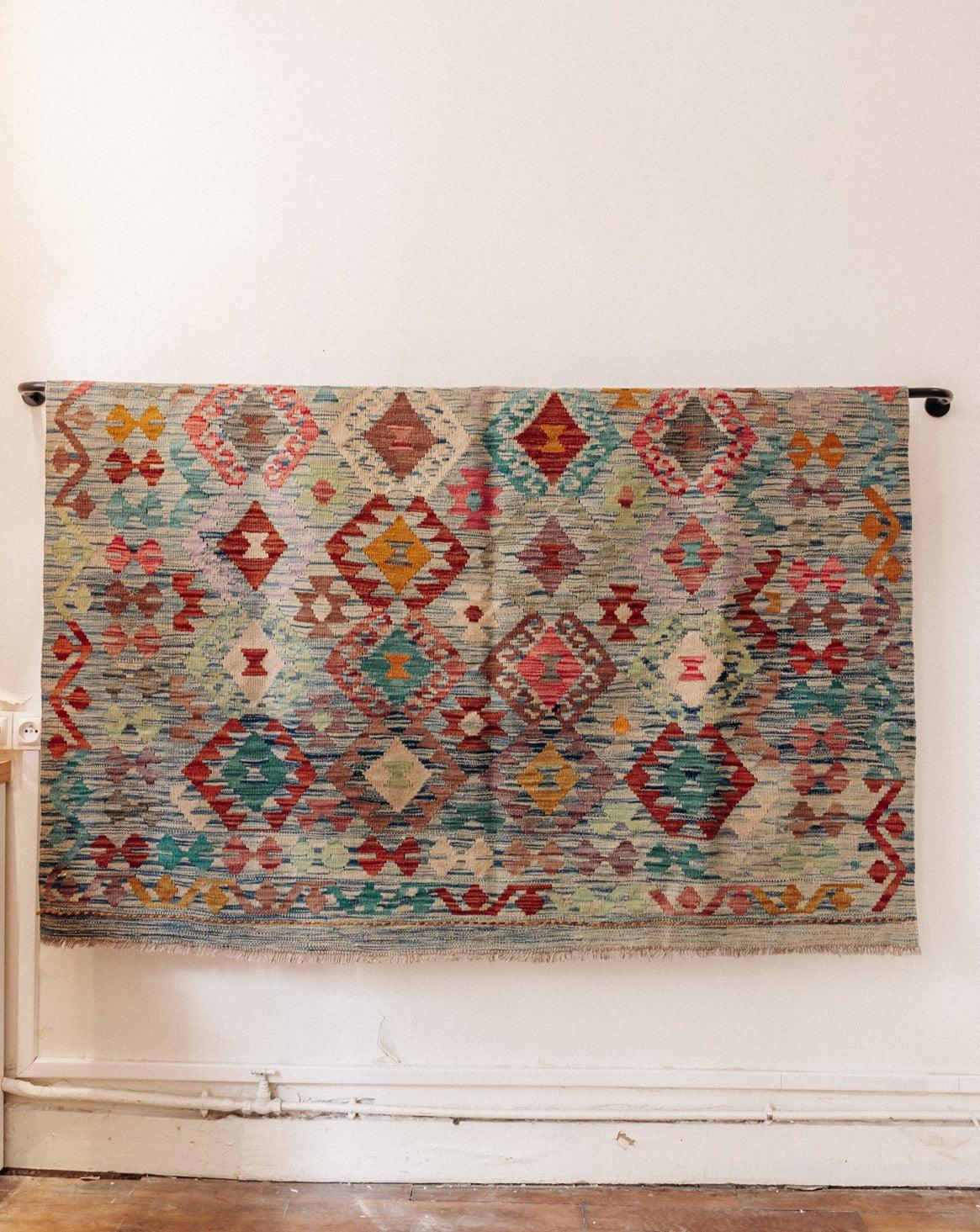 Les kilim sont des tapis brodés à partir de laine, de coton ou de poils de chèvres, originaires de différentes régions du Proche-Orient ou d'Asie centrale. Les allures changent selon leur provenance. Ils sont principalement composés de motifs géométriques colorés. À l'époque, les tapis kilim servaient de couvertures ou de tissus pour protéger le sol des mosquées et des yourtes. Plusieurs siècles plus tard, le tapis Kilim est devenu cet accessoire déco qui réchauffe la pièce ! On l'aime pour son aspect doux et chaud, mais aussi pour ses couleurs éclatantes qui apportent une vraie valeur ajoutée à la décoration.