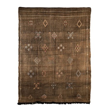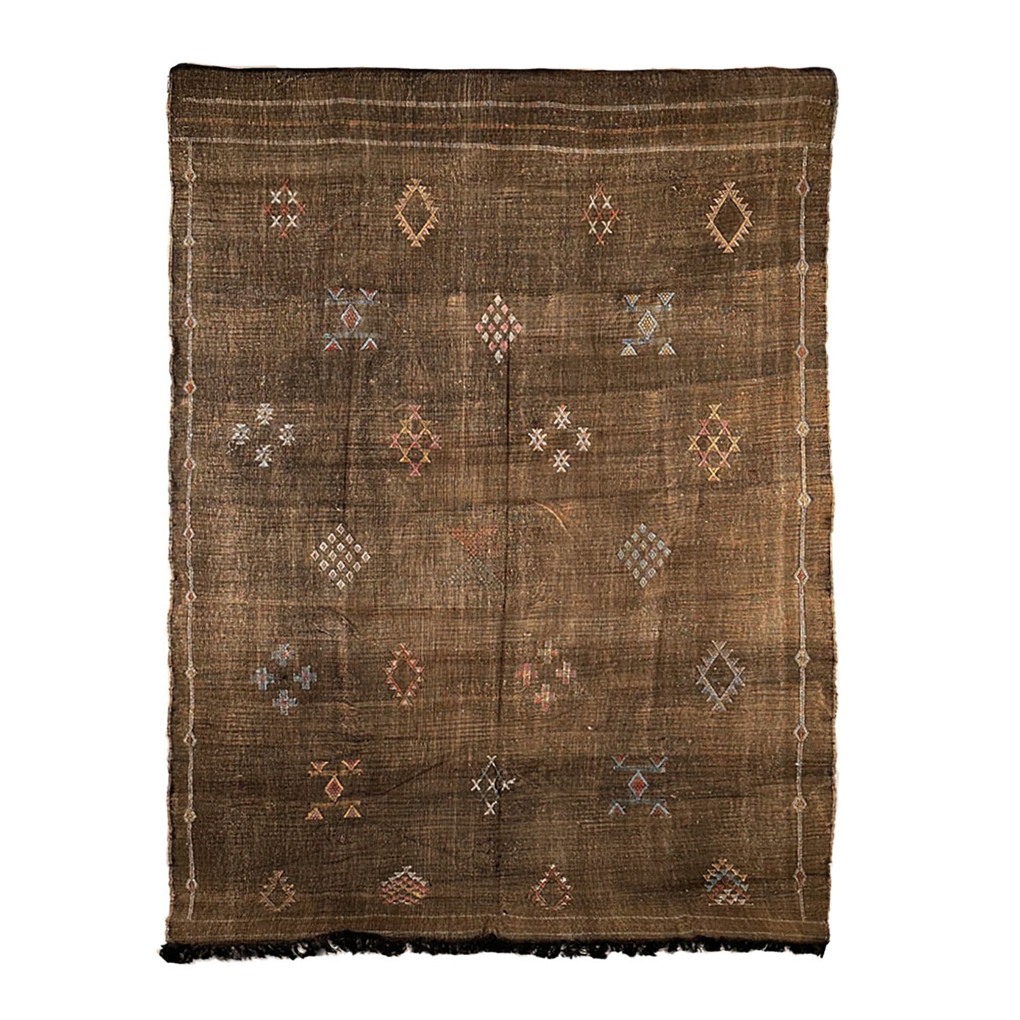 Les tapis Sabra sont fabriqués à partir de la fibre de l'Aloe Vera, une plante de la famille des cactus épineux. Une fois extraites, les fibres sont teintes avec des teintures végétales naturelles qui laissent un aspect soyeux, d'où leur appellation de ""soie de cactus"". Ces tapis sont parmi les rares à être véritablement organiques et vegan, conçus dans le respect de l'environnement. Ils témoignent du lien profond des créateurs berbères avec la terre qui les entoure.
