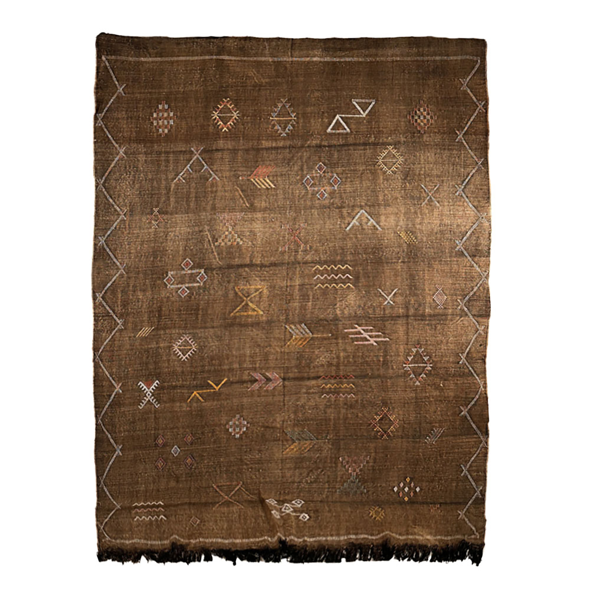 Les tapis Sabra sont fabriqués à partir de la fibre de l'Aloe Vera, une plante de la famille des cactus épineux. Une fois extraites, les fibres sont teintes avec des teintures végétales naturelles qui laissent un aspect soyeux, d'où leur appellation de ""soie de cactus"". Ces tapis sont parmi les rares à être véritablement organiques et vegan, conçus dans le respect de l'environnement. Ils témoignent du lien profond des créateurs berbères avec la terre qui les entoure.