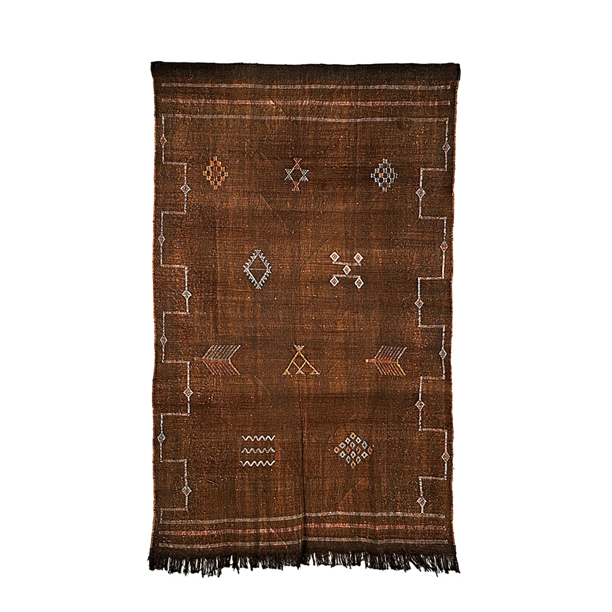 Les tapis Sabra sont fabriqués à partir de la fibre de l'Aloe Vera, une plante de la famille des cactus épineux. Une fois extraites, les fibres sont teintes avec des teintures végétales naturelles qui laissent un aspect soyeux, d'où leur appellation de ""soie de cactus"". Ces tapis sont parmi les rares à être véritablement organiques et vegan, conçus dans le respect de l'environnement. Ils témoignent du lien profond des créateurs berbères avec la terre qui les entoure.