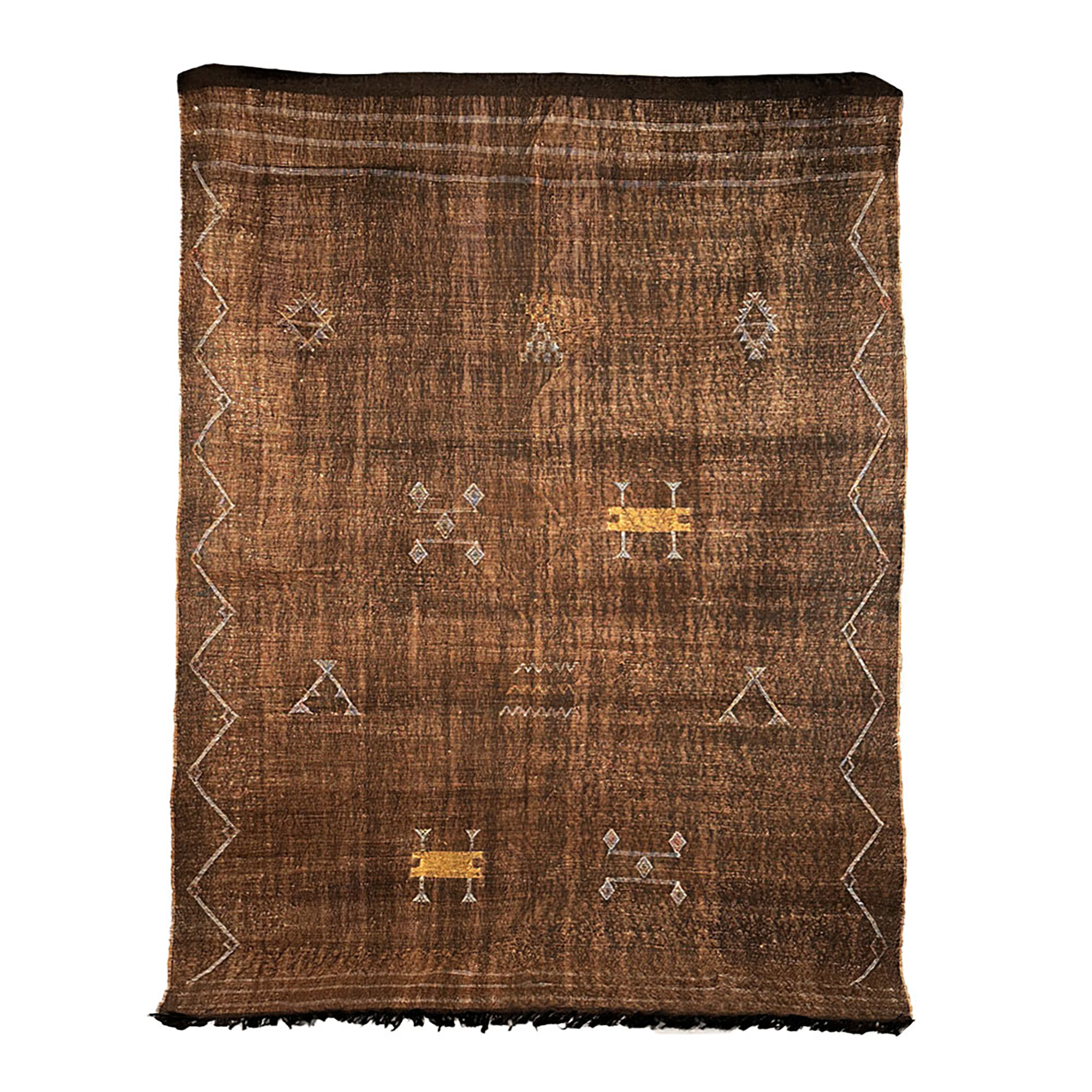 Les tapis Sabra sont fabriqués à partir de la fibre de l'Aloe Vera, une plante de la famille des cactus épineux. Une fois extraites, les fibres sont teintes avec des teintures végétales naturelles qui laissent un aspect soyeux, d'où leur appellation de ""soie de cactus"". Ces tapis sont parmi les rares à être véritablement organiques et vegan, conçus dans le respect de l'environnement. Ils témoignent du lien profond des créateurs berbères avec la terre qui les entoure.