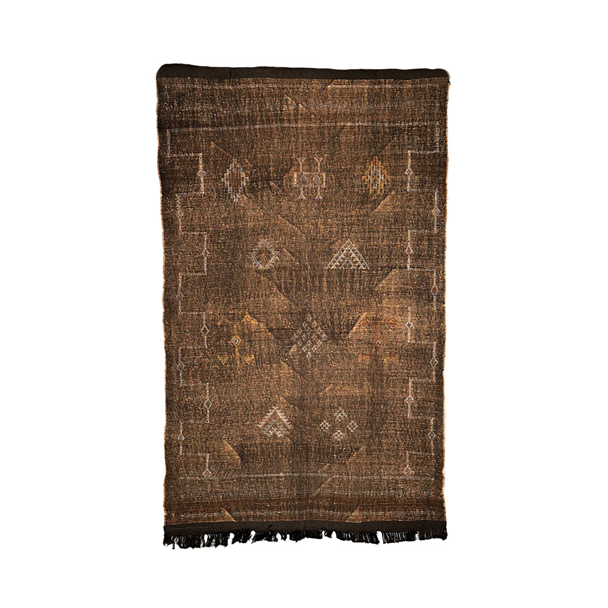 Les tapis Sabra sont fabriqués à partir de la fibre de l'Aloe Vera, une plante de la famille des cactus épineux. Une fois extraites, les fibres sont teintes avec des teintures végétales naturelles qui laissent un aspect soyeux, d'où leur appellation de ""soie de cactus"". Ces tapis sont parmi les rares à être véritablement organiques et vegan, conçus dans le respect de l'environnement. Ils témoignent du lien profond des créateurs berbères avec la terre qui les entoure.