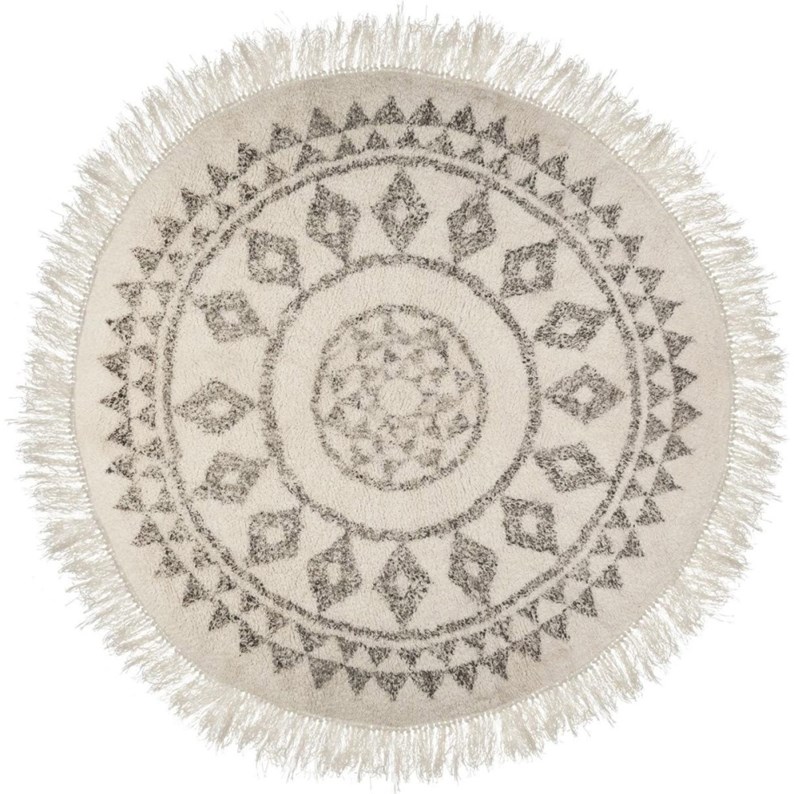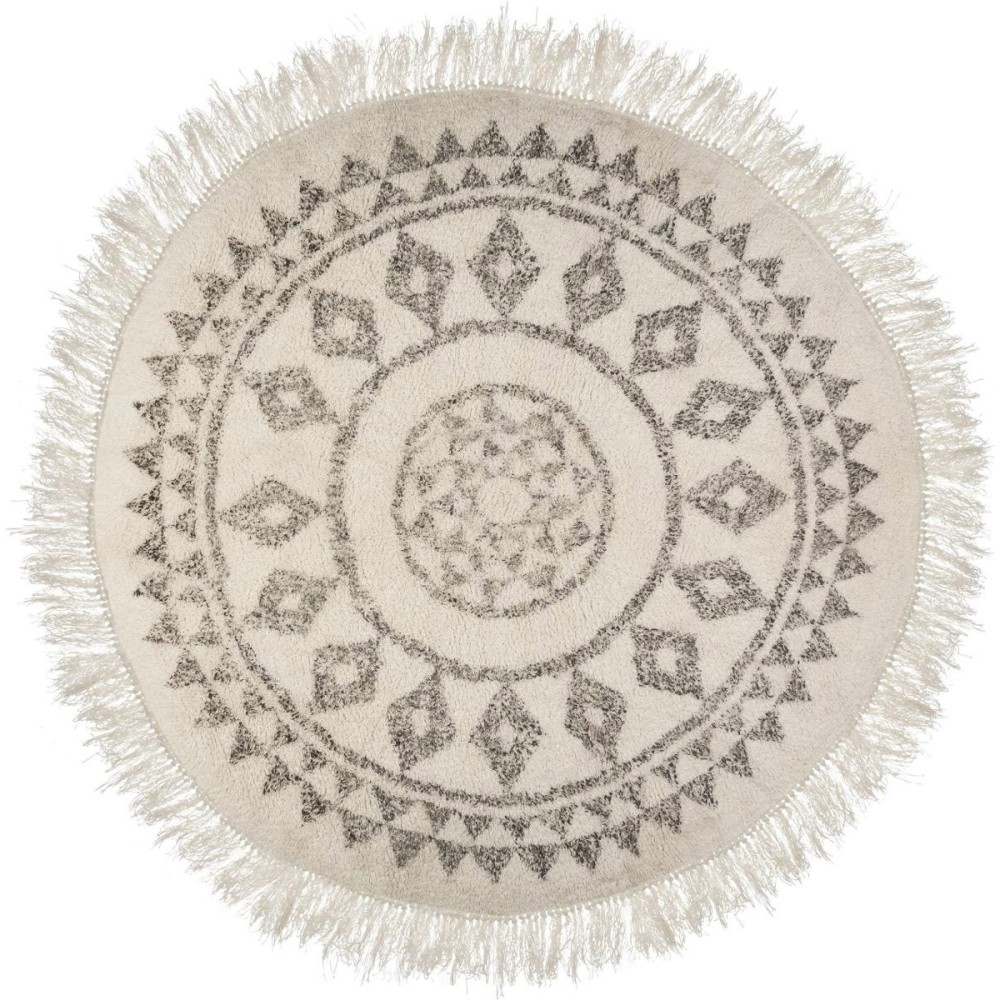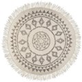 Magnifique grand tapis rond Etnik d'un diamètre de 120 cm avec franges et motifs graphiques géométriques. Pour réchauffer votre déco, adoptez immédiatement ce tapis ethnique en coton et polyester dans votre intérieur.