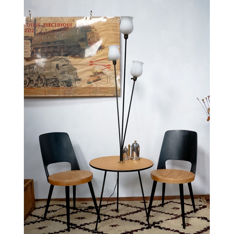 Sublimez votre intérieur avec ce lampadaire guéridon tripode des années 50, qui marie métal tubulaire et plateau en contreplaqué pour une silhouette légère et structurée. Ses trois globes tulipe en opaline blanche diffusent une lumière douce et modulable grâce aux douilles à baïonnette et aux interrupteurs individuels. La hauteur généreuse du lampadaire associée à un plateau bas, pensé pour poser une tasse ou un livre, en fait une pièce à la fois fonctionnelle et décorative, idéale près d'un coin lecture ou d'un canapé. Son design années 50 apporte une atmosphère chaleureuse et vintage sans ostentation.