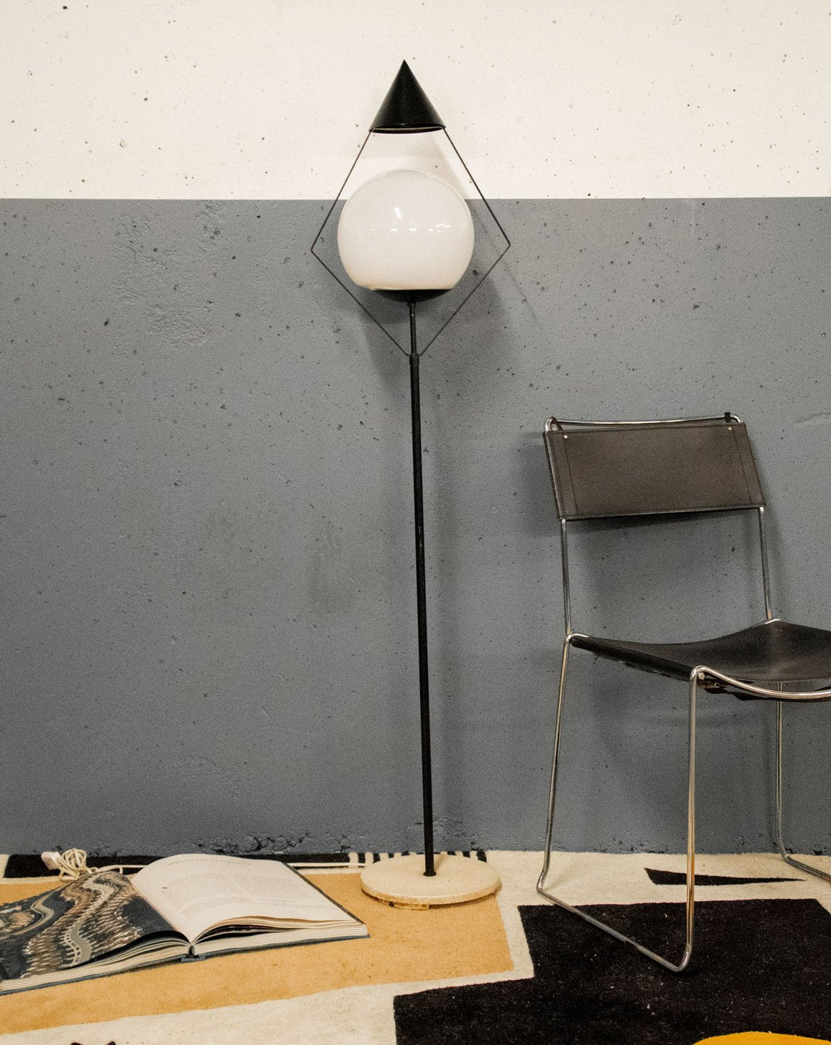 Sublimez votre intérieur avec ce lampadaire italien des années 1980 en métal laqué noir et globe opaline, au design graphique et architectural. Le socle circulaire blanc et le pied tubulaire soutiennent un réflecteur conique qui met en valeur un globe opalin enchâssé dans un triangle noir, créant un jeu de contrastes élégant. Ses lignes élancées et la lueur du globe diffusent une lumière douce idéale pour un salon, un coin lecture ou une entrée, apportant une atmosphère feutrée et contemporaine. Très bon état général.