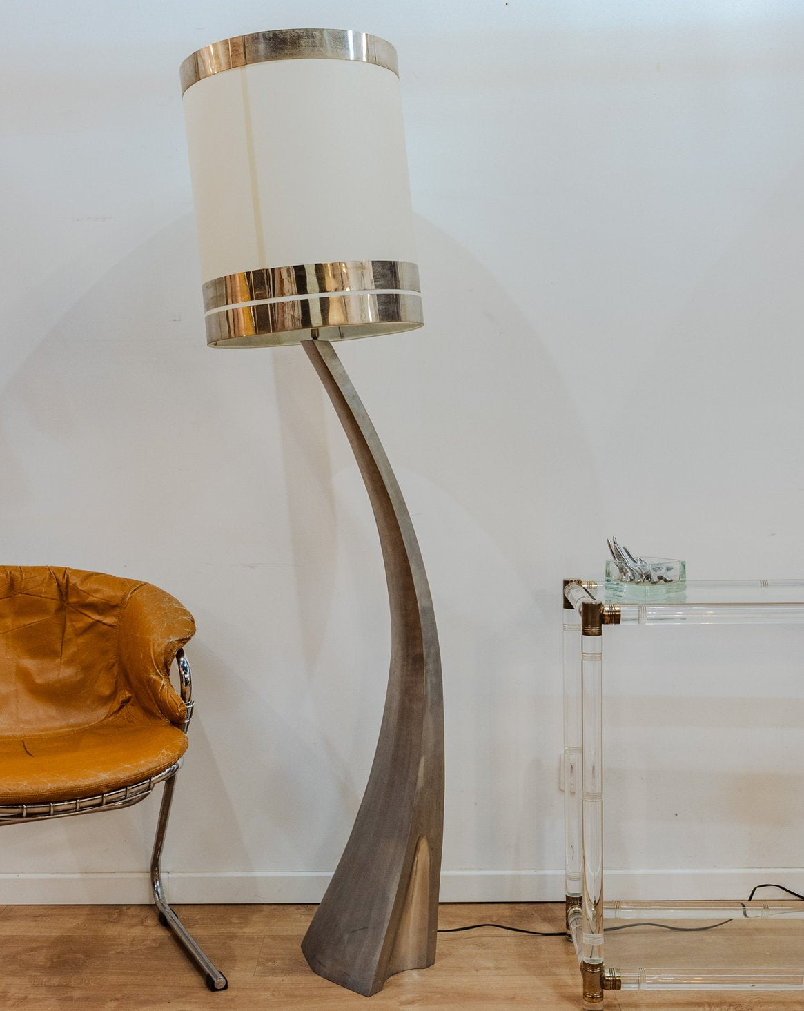 Sublimez votre intérieur avec ce lampadaire chromé inspiré du style Space Age, dont la silhouette haute et élancée capte le regard. Son abat-jour imposant blanc, diffuse une lumière douce et enveloppante, idéale pour un coin lecture ou pour créer une ambiance vintage contemporaine. Quelques traces du temps présentes.