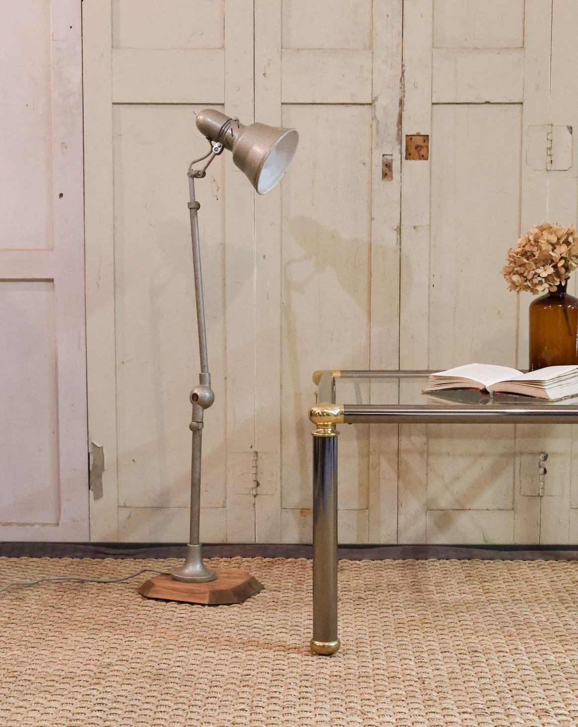 Ajoutez une touche industrielle raffinée avec ce lampadaire en métal argenté au socle en bois, au design élancé et à l'empreinte au sol discrète. L'abat-jour et la tige réglables permettent d'orienter la lumière selon vos besoins, idéal pour un coin lecture, un bureau ou une chambre où la précision d'éclairage compte. Le mariage du métal et du bois installe une ambiance chaleureuse et contemporaine, alliant robustesse et élégance sobre.