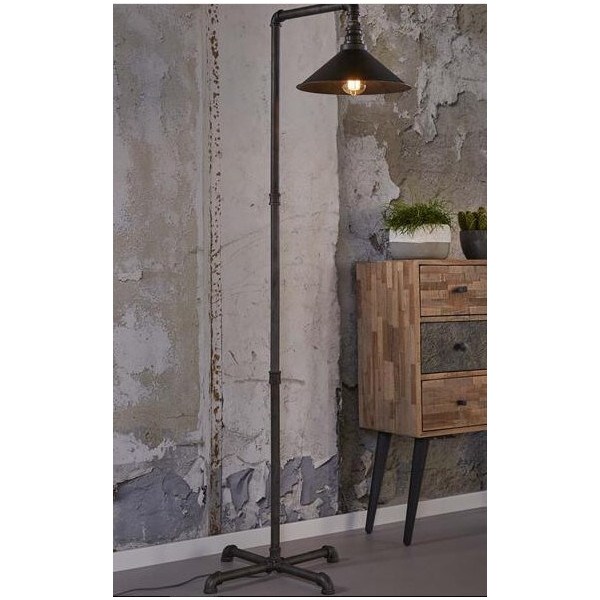 L'abat-jour conique en métal est supporté par un tube noir résolument industriel.
