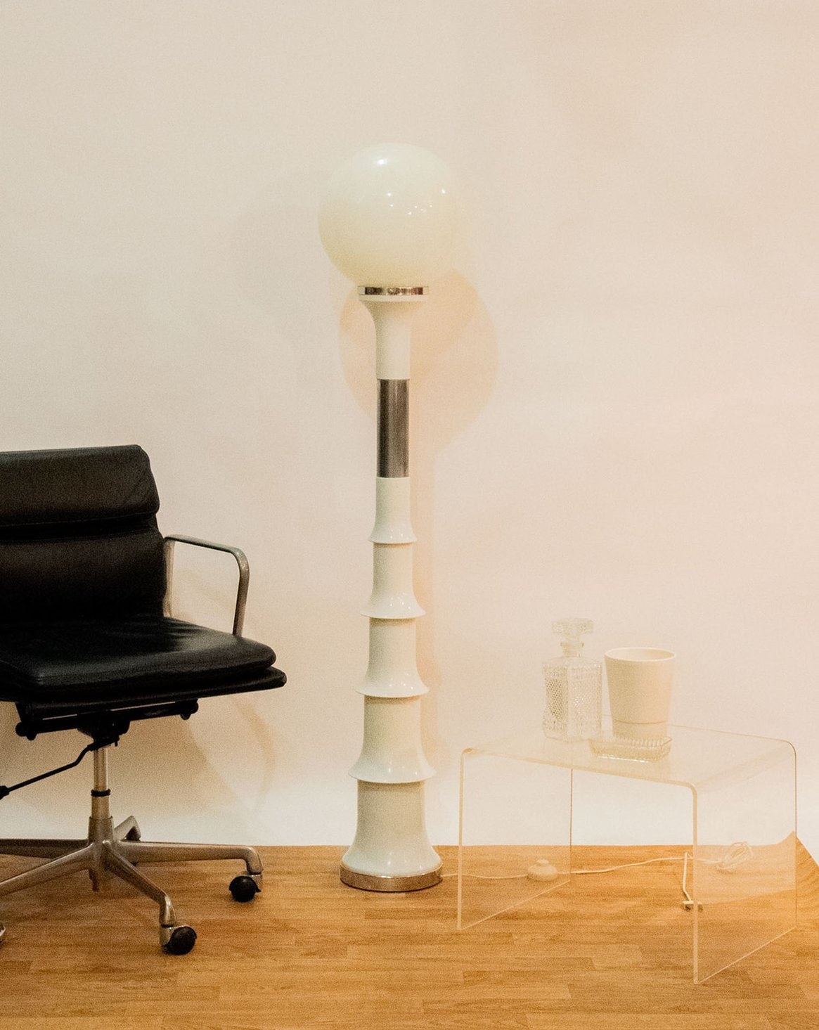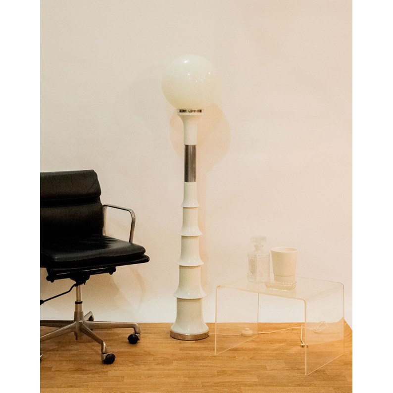 Ce lampadaire futuriste, modèle Bambou du designer Enrico Tronconi, allie design audacieux et élégance. Sa structure en métal laqué blanc et chromé se marie parfaitement au verre opalin diffusant une lumière douce. Idéal pour sublimer un salon ou un bureau, il apporte une touche contemporaine et artistique à votre intérieur. Son style unique en fait une véritable pièce de collection. Un luminaire qui combine modernité, esthétisme et fonctionnalité.