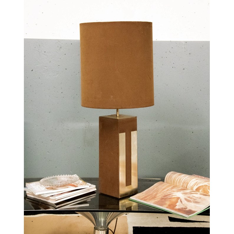 Ajoutez une touche rétro avec cette grande lampe de table des années 70, au pied rectangulaire vertical revêtu de similicuir marron et orné de deux bandes en acier doré, évoquant les univers de Pierre Cardin et Willy Rizzo. Son abat-jour circulaire d'origine, assorti à la même texture, diffuse une lumière douce et enveloppante tandis que l'électrification d'origine est entièrement fonctionnelle, idéale pour un salon, une bibliothèque ou une chambre. Ses proportions généreuses apportent une présence élégante et sculpturale qui structure l'espace.