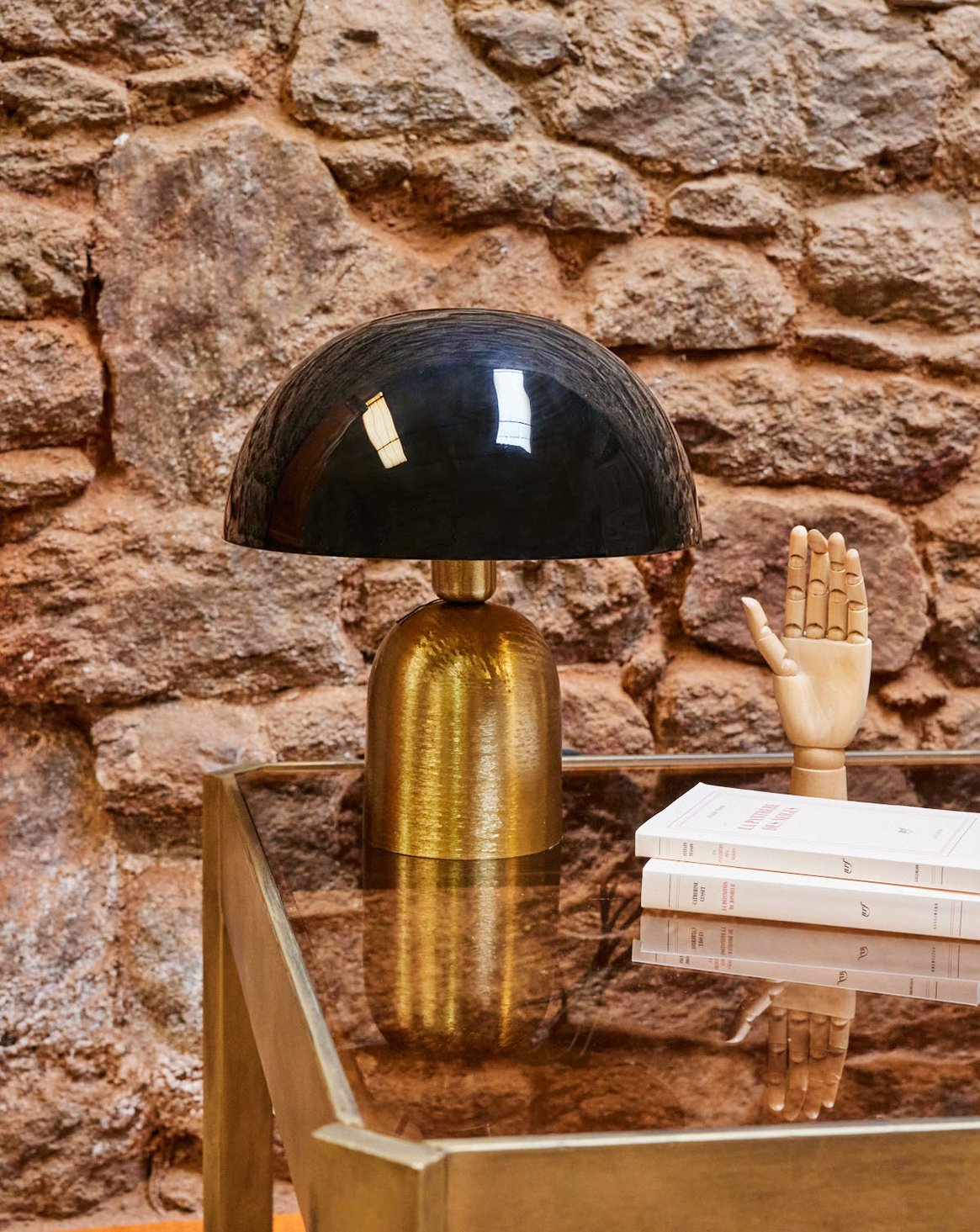 Ajoutez une note d'élégance rétro avec cette lampe à poser, dotée d'un abat-jour noir et d'un pied doré, dont la silhouette champignon évoque le design vintage remis au goût du jour. Le contraste mat du diffuseur et la finition métallique du pied mettent en valeur les matériaux tout en diffusant une lumière douce, idéale pour une table de chevet ou un coin lecture. Sa présence sculpturale habille subtilement un salon contemporain ou un bureau, créant une atmosphère chaleureuse et raffinée.