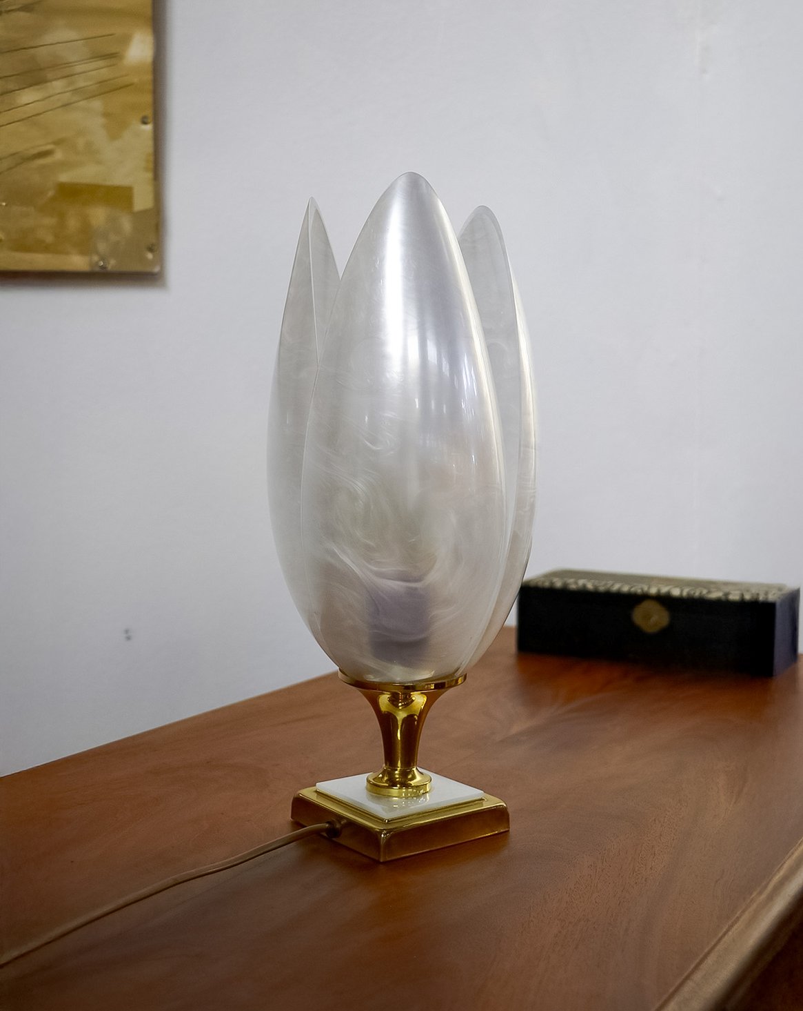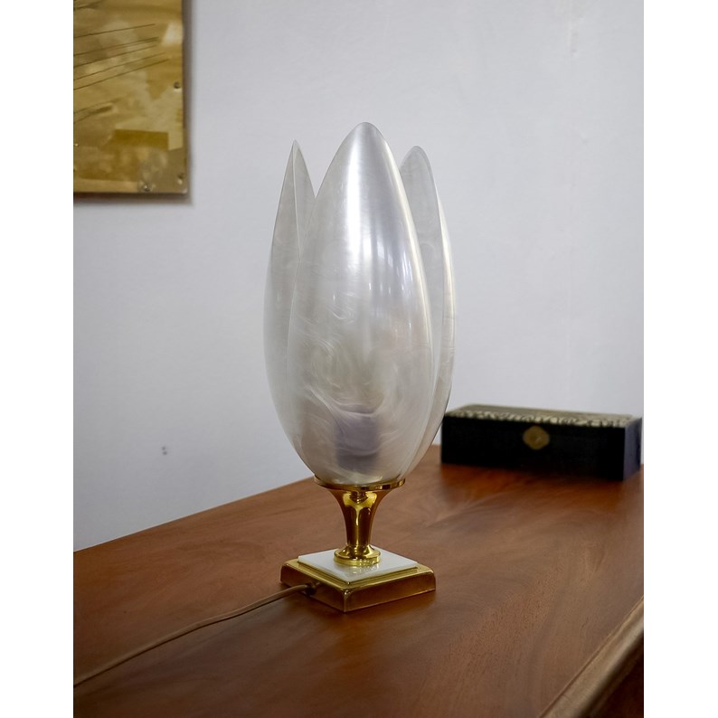 Découvrez la lampe modèle Tulipe signée Maison Rougier, un élégant exemplaire des années 70 aux pétales en polycarbonate blanc façon nacre reposant sur un socle en laiton doré. Sa silhouette haute et étroite s'intègre facilement près d'un canapé ou sur une console, offrant un éclairage doux grâce à une ampoule à visser qui met en valeur la diffusion nacrée. Son style vintage chic apporte une ambiance chaleureuse et feutrée à tout intérieur.