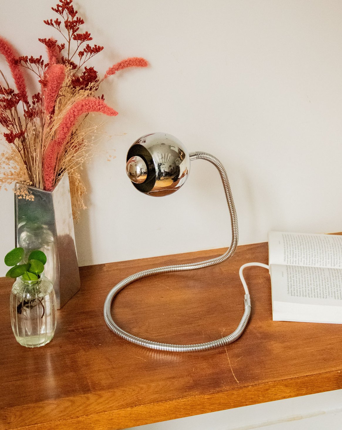 Sublimez votre intérieur avec cette lampe «Cobra» des années 1970, attribuée au designer italien Goffredo Reggiani. Sa tête eyeball et son flexible en chrome dessinent une silhouette graphique et permettent une grande liberté de positionnement, idéale pour la lecture, l'éclairage d'appoint ou une mise en scène décorative. Sa ligne allongée et élancée s'intègre parfaitement sur une console, apportant une note vintage contemporaine et délicate. Ampoule E14 à bout chromé fournie.