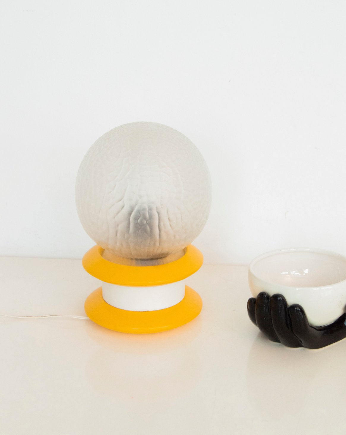 Découvrez la lampe globe en verre texturé semi-transparent posée sur une base en bois jaune, une pièce qui marie douceur des matériaux et silhouette compacte. Le globe diffuse une lumière tamisée, idéale pour créer une atmosphère chaleureuse sur une table de chevet, un bureau ou une console, tandis que le bois peint apporte une note colorée et naturelle. Ses proportions étudiées la rendent parfaite pour les petits espaces, offrant une présence discrète mais affirmée.