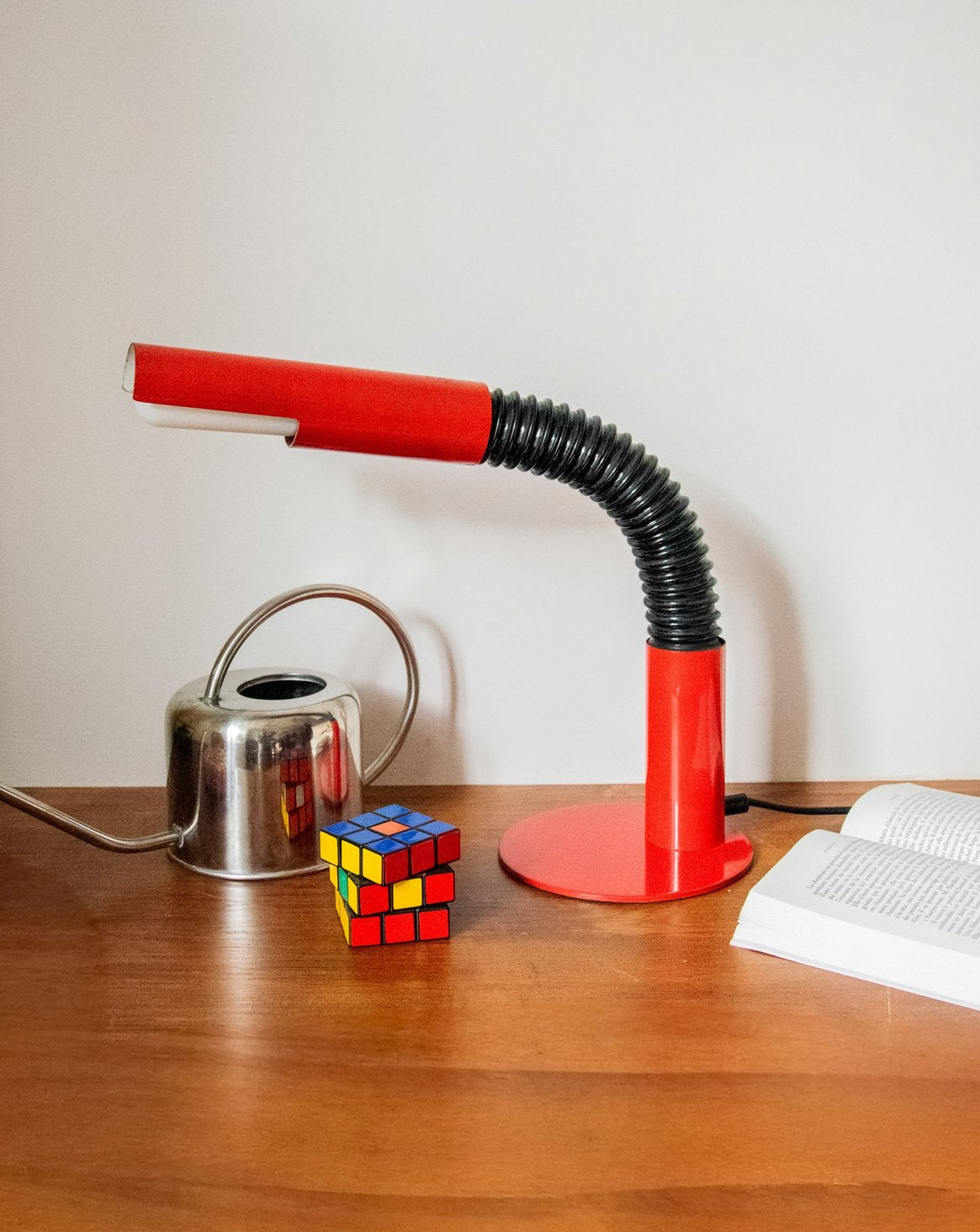 Découvrez cette lampe à poser des années 1970 attribuée à E. Bellini pour Targetti Sankey, au vocabulaire industriel rehaussé d'un rouge acier et d'un gainage noir flexible. Sa silhouette compacte s'installe facilement sur un bureau ou une table de chevet et l'ampoule tubulaire en porcelaine fournie diffuse une lumière douce, idéale pour une atmosphère tamisée. L'électricité a été refaite à neuf, l'interrupteur et la fiche remplacés, pour une utilisation sereine qui allie design rétro et fonctionnalité contemporaine.