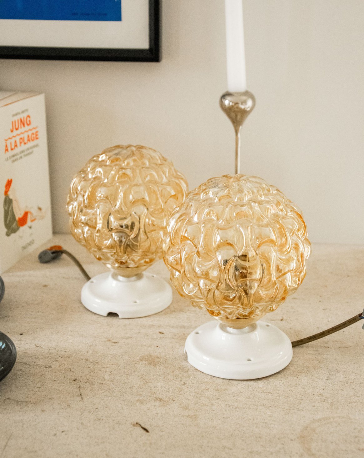 Invitez une atmosphère chaleureuse avec cette paire d'appliques en verre fumé jaune, aux formes rondes et au verre texturé. Le verre diffusant atténue la lumière pour créer une ambiance feutrée, idéale en tête de lit, dans une entrée ou pour éclairer un coin salon. Le format compact et les proportions contenues s'intègrent discrètement sur tout mur, apportant caractère et douceur lumineuse sans imposer. Le travail du verre texturé révèle une élégance sobre et tactile.