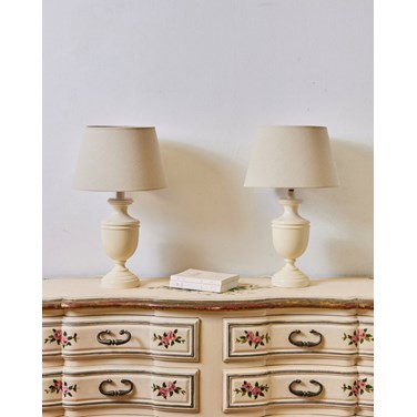Apportez une paire de lampes en bois laqué ivoire au pied balustre, dont l'élégance classique se pare d'une teinte douce et d'un abat-jour neuf diffusant une lumière enveloppante; leur silhouette aux proportions équilibrées s'intègre aussi bien sur deux tables de chevet que sur une console d'entrée, offrant un éclairage d'appoint chic et discret, et instaurant une ambiance chaleureuse et raffinée propice aux intérieurs sobres et accueillants.
