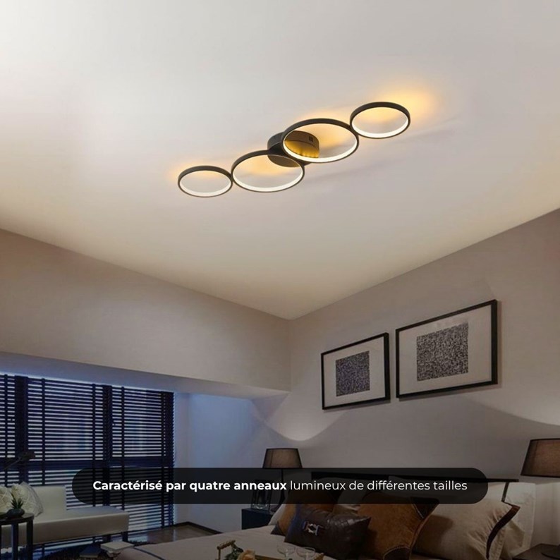 Le plafonnier Ring se distingue par son design moderne avec quatre formes circulaires entrelacées, offrant une esthétique élégante et unique. L'agencement symétrique des anneaux diffuse une lumière douce et uniforme, idéale pour illuminer une chambre, un salon ou une salle à manger. Sa forme géométrique et minimaliste apporte une touche raffinée qui complète parfaitement un décor contemporain, tandis que son design plat et discret en fait un choix idéal pour les plafonds bas.