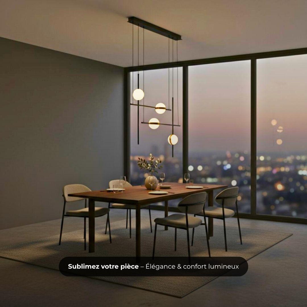 La suspension Jun allie avec finesse la robustesse du fer, la légèreté de l’aluminium et l’élégance translucide de l’acrylique. Son design contemporain est souligné par une composition asymétrique de sphères lumineuses qui semblent flotter dans l’air, offrant ainsi une présence visuelle à la fois audacieuse et aérienne.