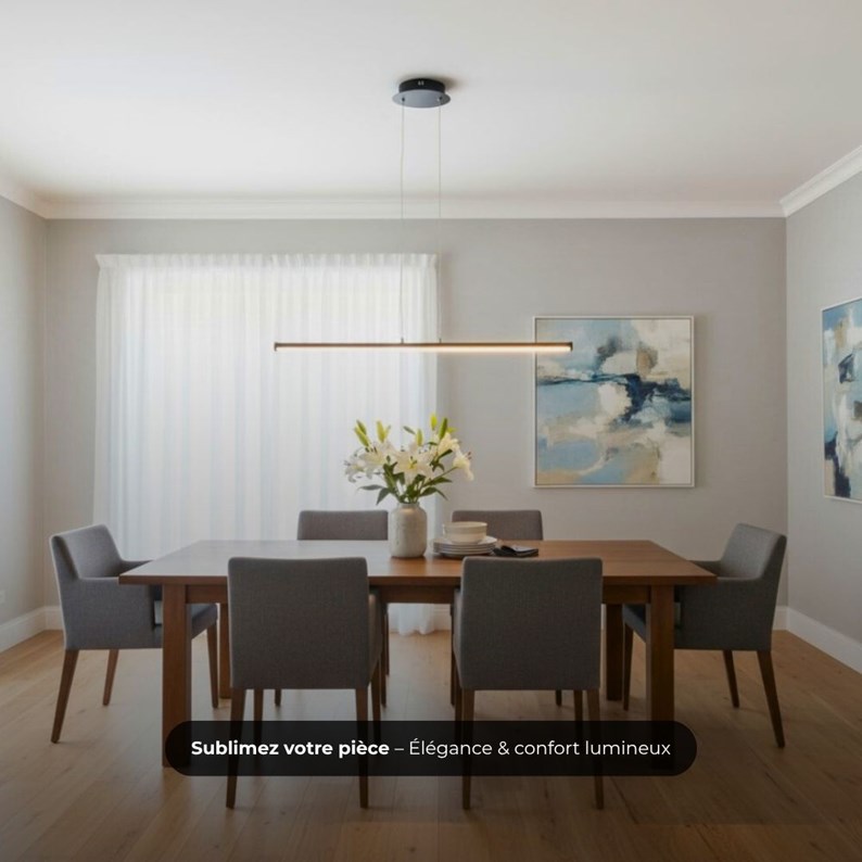 L’éclairage LED intégré de la Lampe Suspension Sol, encadré par une barre noire discrète, est non seulement un gage d’efficacité énergétique, mais aussi de confort visuel. La fonctionnalité dimmable vous offre la possibilité de créer une ambiance sur mesure, allant d’un éclairage vif et dynamique à une lumière douce et tamisée selon les occasions.