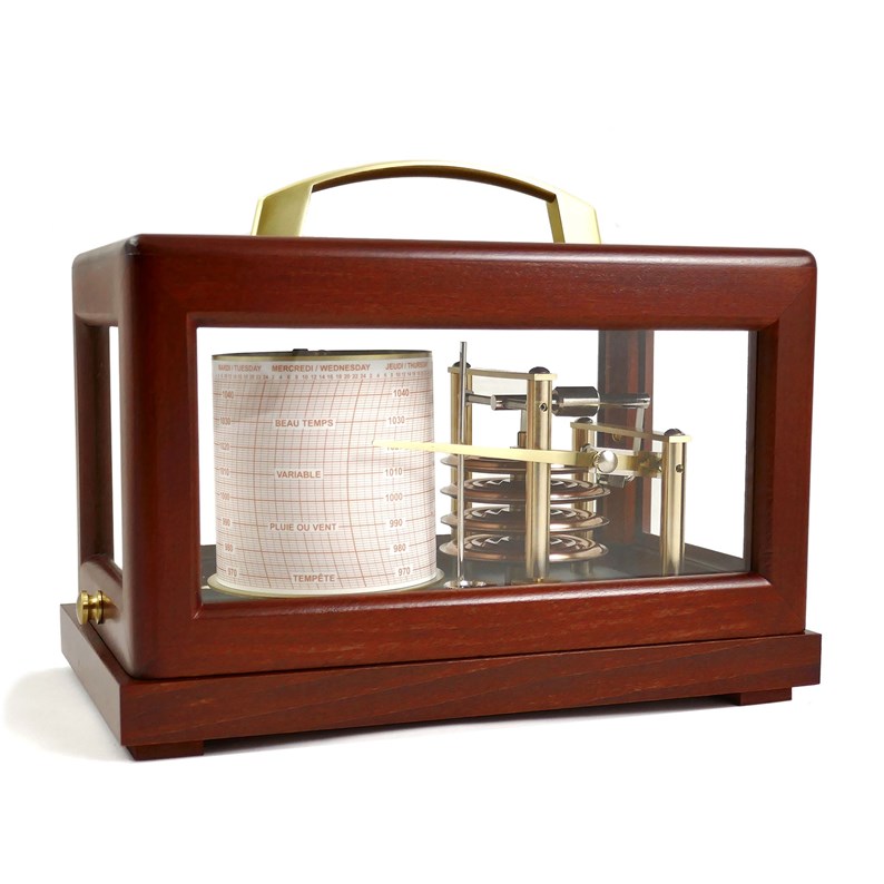 Un baromètre enregistreur, ou barographe, trace sur un cylindre qui tourne sur lui-même les variations de la pression atmosphérique : une pression qui baisse est généralement synonyme de mauvais temps, une pression qui augmente annonce le beau temps. Généralement les changement de pression précèdent les changements de météo de 4 heures environ. C'est donc un instrument de prévision.